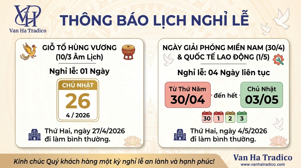 Nhằm giúp Quý khách chủ động trong kế hoạch đặt hàng và sản xuất, Công ty Vân Hà xin trân trọng thông báo lịch nghỉ lễ Giỗ Tổ Hùng Vương và 30/4 – 1/5 năm 2026 như sau: